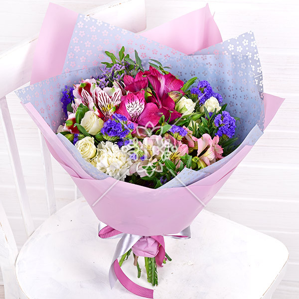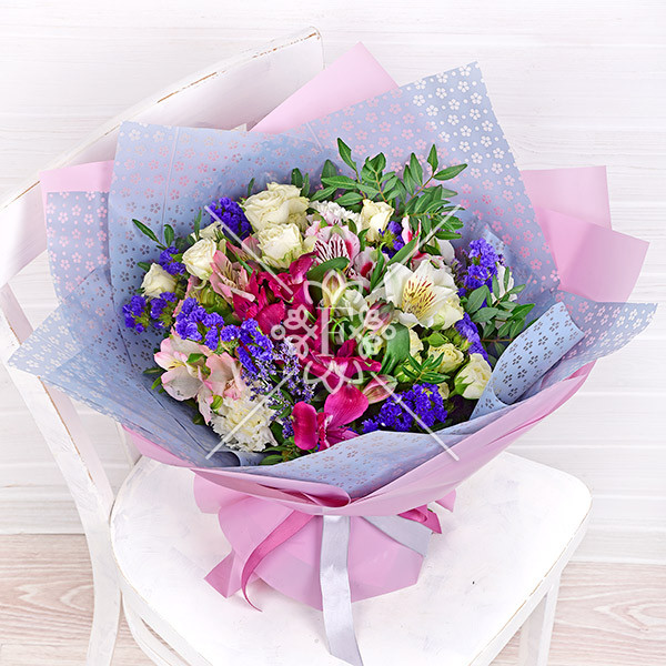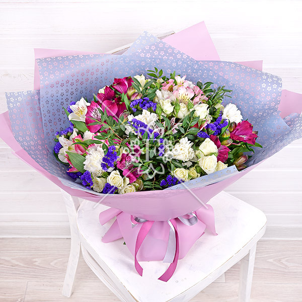 роза белая кустовая – 2 шт., альстромерия белая, розовая, фиолетовая – 2 шт., гвоздика белая – 1 шт., статица фиолетовая – 2 шт., зелень декоративная (фисташка), упаковка, лента.